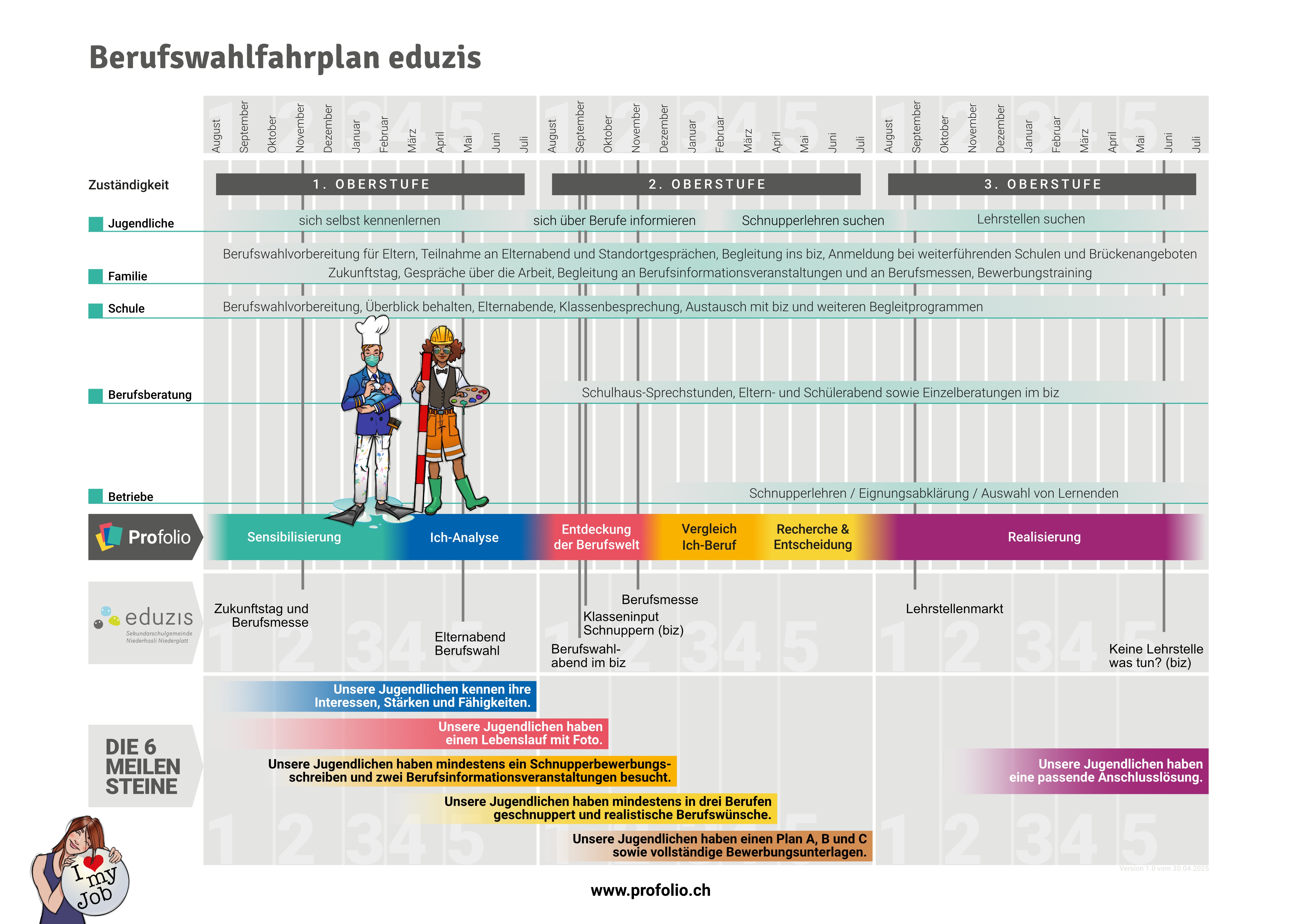 Unser Berufswahlfahrplan ist auf die sechs Kapitel im Berufswahl-Lernmedium und die Veranstaltungen der Schule und des Kantons abgestimmt.