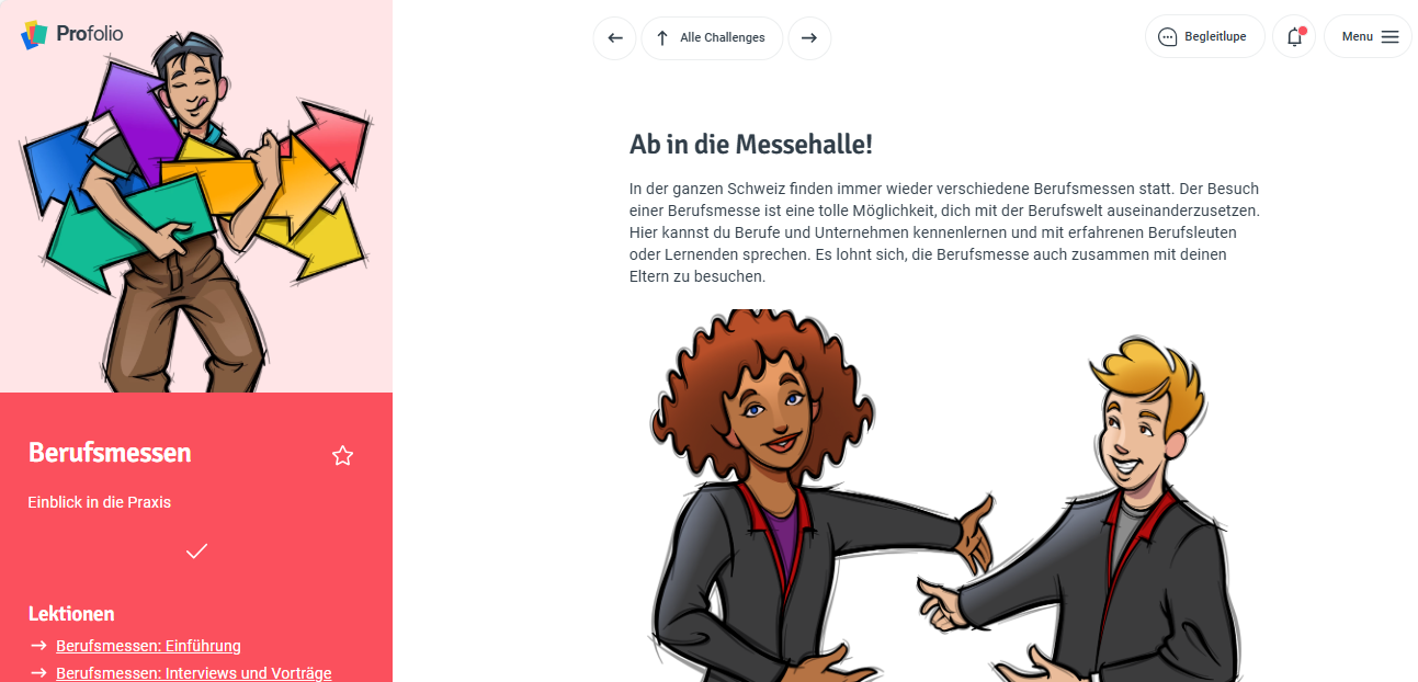 Im digitalen Berufswahl-Lehrmittel Profolio findest du die Challenge «Ab in die Messehalle!» mit Tipps & Tricks, um deinen Messebesuch gezielt vorzubereiten, inklusive Interview-Fragebögen. Mit der kostenlosen Profolio-Demolizenz kannst du alle Inhalte der Challenge ausprobieren.